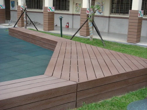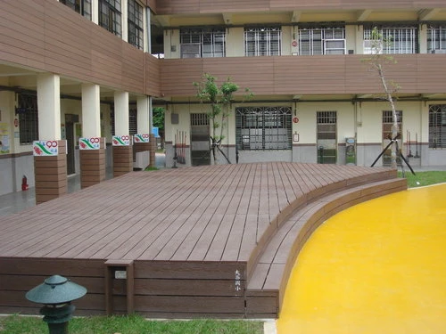 這是我們在國小裡增設的塑木平台,注意看它還有景觀木牆的包覆,女兒牆如果有比較老舊的直接鎖我們的仿木系列產品也是一種外觀的改善,就連柱子也有包覆