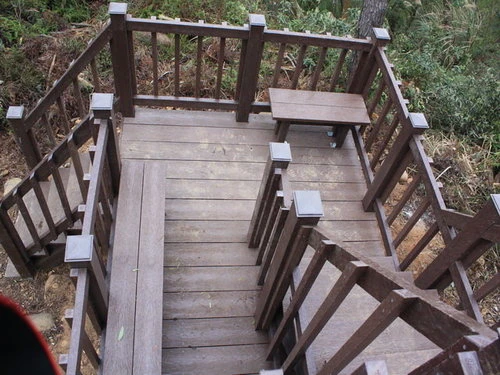 登山步道的遼望台景觀台這個全都是塑木做的,支柱有含鐵管可增加它的鋼性,內容有座椅和樓梯及平台加欄杆